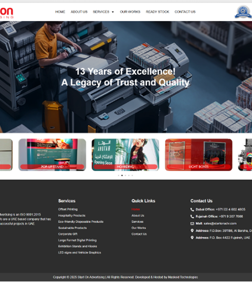 Start On Advertising needed a premium website to reflect its capabilities in signage, branding, and digital media. We delivered a modern, media-heavy interface with service-driven layouts and responsive visuals. Outcome: Strengthened digital credibility and better engagement with B2B clients.